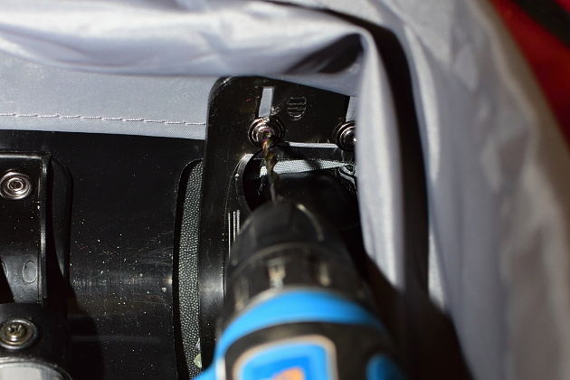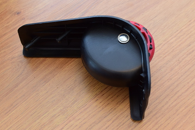 Postup budeme ilustrovat na opravě kufru značky High Sierra. Postup lze však opakovat i pro jiné značky kufrů. Aby bylo možné vložit a utáhnout osičku nového kolečka, bylo třeba vymontovat celé uchycení kolečka, které však bylo přinýtované.