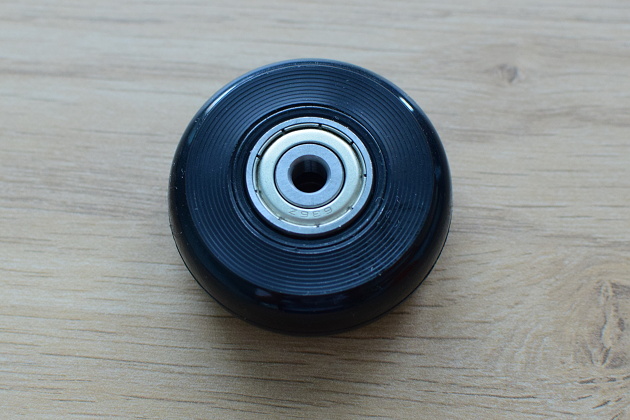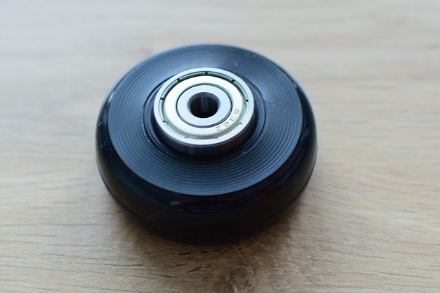 Po vložení obou ložisek uchopíme střed ložisek mezi palec a ukazováček a zkusíme kolečem pojezdit po stole. Přitom zkontrolujeme, že se kolečko dobře otáčí a nehází. Pokud kolečko hází, překontrolujeme usazení ložisek a případně je dorovnáme.