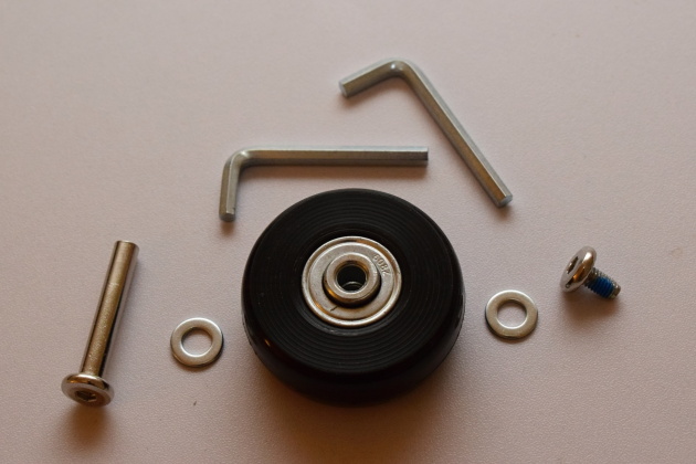 Nové kolečko vložíme na místo původního a uchytíme ho pomocí nové šroubovací osičky. Pokud by kolečko někde drhlo o držák, může pomoci umístit na obě strany mezi držák a kolečko podložky.