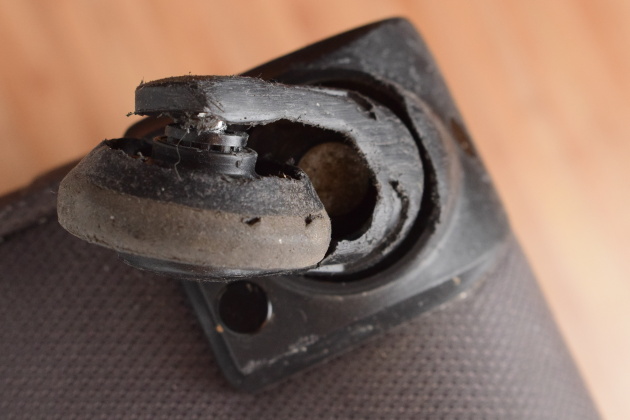 Kolečka cestovních kufrů a zavazadel jsou většinou přinýtovaná. Původní osičku tak musíme odvrtat nebo odříznout. Nejjednodušší je její odříznutí pilkou na železo.